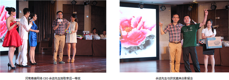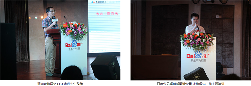 蒞臨本次答謝會現(xiàn)場的領(lǐng)導(dǎo)有:百度公司渠道部渠道經(jīng)理宋鋒輝先生,百度公司業(yè)務(wù)運營部區(qū)域經(jīng)理何蓓女士,河南青峰網(wǎng)絡(luò)科技有限公司CEO 余進先生。會議前半場,青峰網(wǎng)絡(luò)CEO余進先生致開場詞,并帶來了《未來撲面而來》的精彩演講,帶領(lǐng)與會嘉賓一起回顧了互聯(lián)網(wǎng)發(fā)展的潮流,并以自己多年互聯(lián)網(wǎng)從業(yè)經(jīng)驗,預(yù)測未來互聯(lián)網(wǎng)發(fā)展的趨勢,引得臺下陣陣掌聲。接下來,由百度公司渠道部渠道經(jīng)理宋鋒輝先生帶來主題演講,宋經(jīng)理向到場的嘉賓介紹了百度2013年在各領(lǐng)域取得的巨大成就,并著重介紹了百度推廣新推出的品牌起跑線、問答營銷、企業(yè)之窗等新產(chǎn)品,擴大了客戶網(wǎng)絡(luò)營銷的視野,堅定了與會嘉賓與百度推廣一起成長的信心。